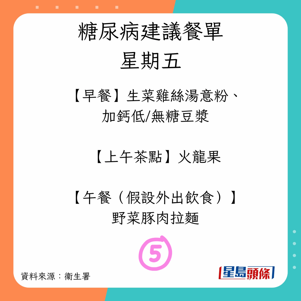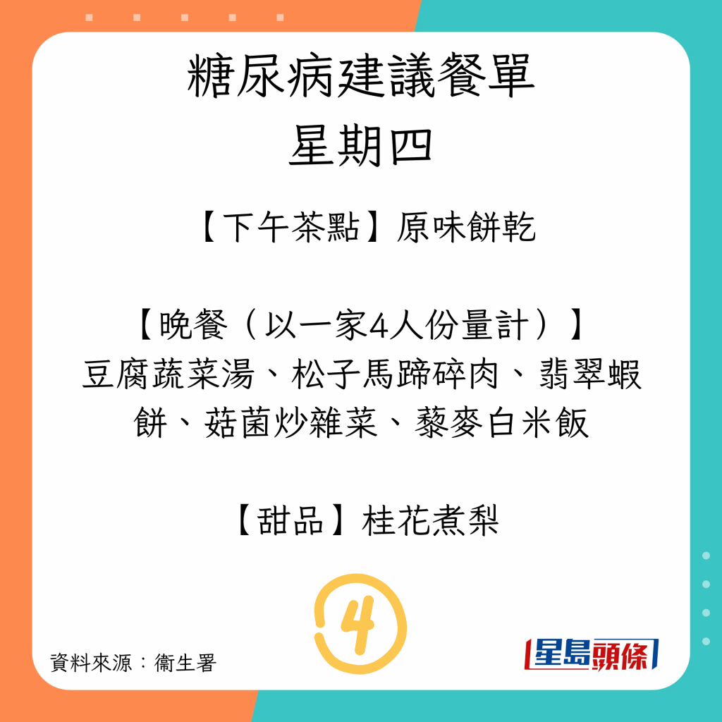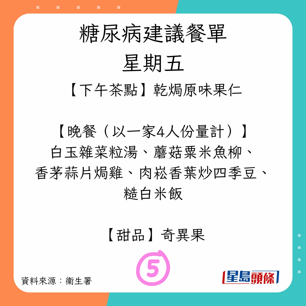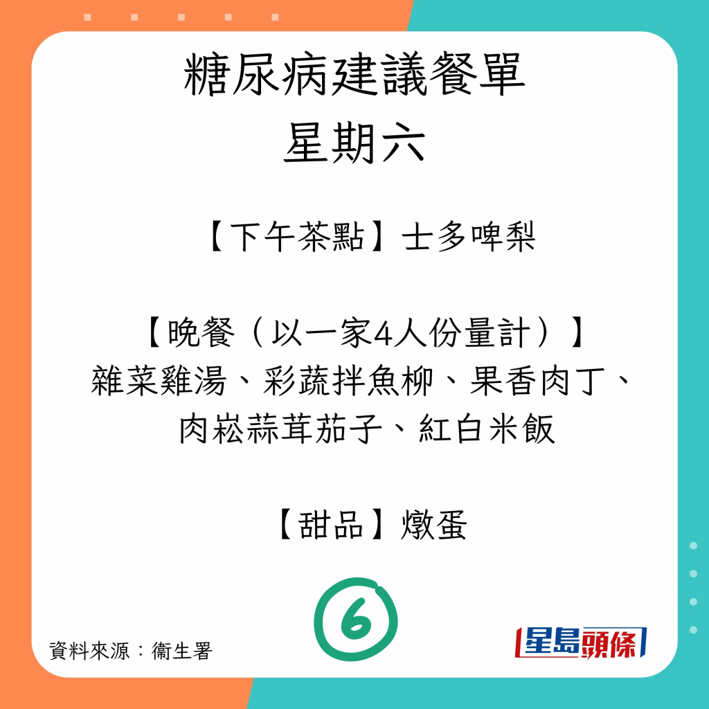 患糖尿病后要戒口嗎? 吃甚么可避免病情惡化? 本港衛生署建議,糖尿病患者可以參考以下餐單,準備7日的食物份量: