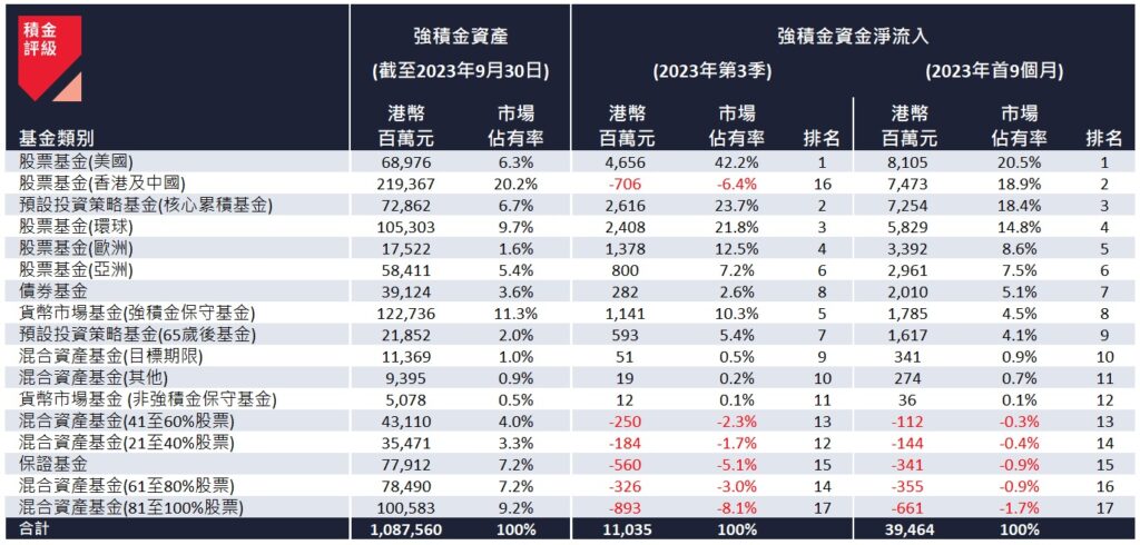 2023 年第 3 季及首 9 個月的強積金資產類別資金流。