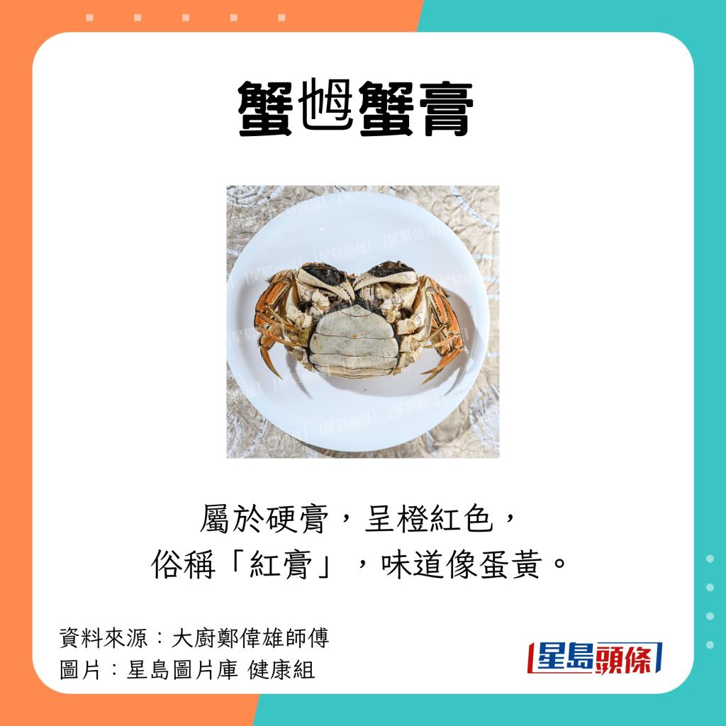 2. 蟹心:比較寒涼,進食后會寒上加寒,容易引致腸胃不適,不宜食用。