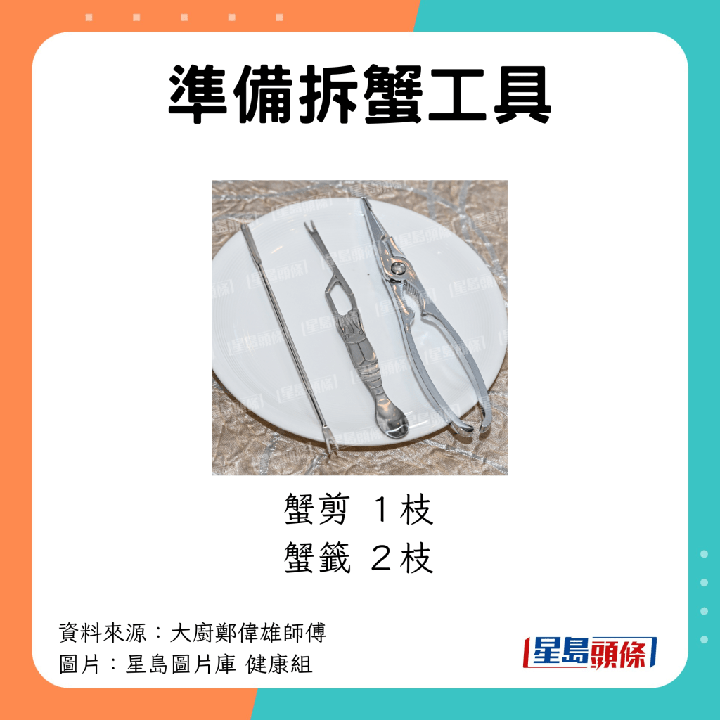 怎樣拆大閘蟹,以避開髒物及最寒涼部位?怎樣可以拆出更多蟹肉,好好品嘗?鄭師傅受訪指,拆蟹前,需要預備蟹剪及2枝蟹鉗,然后按以下步驟拆蟹: