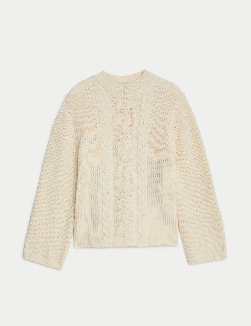 ▲即日至10月31日,于馬莎以正價選購針織衫2件或以上8折,圖為綴飾扭紋針織花圓領毛衣/HK$449。 (馬莎)