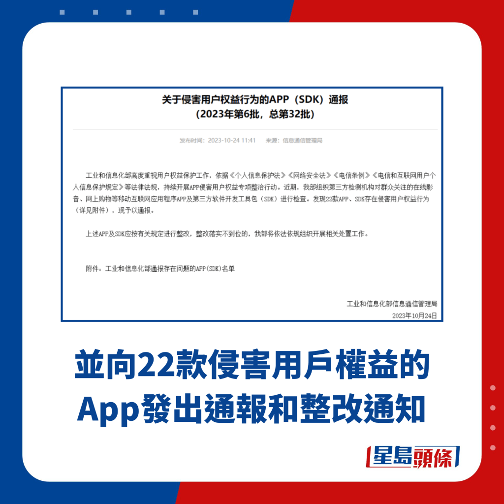 ▲并向22款侵害用戶權益的App發出通報和整改通知