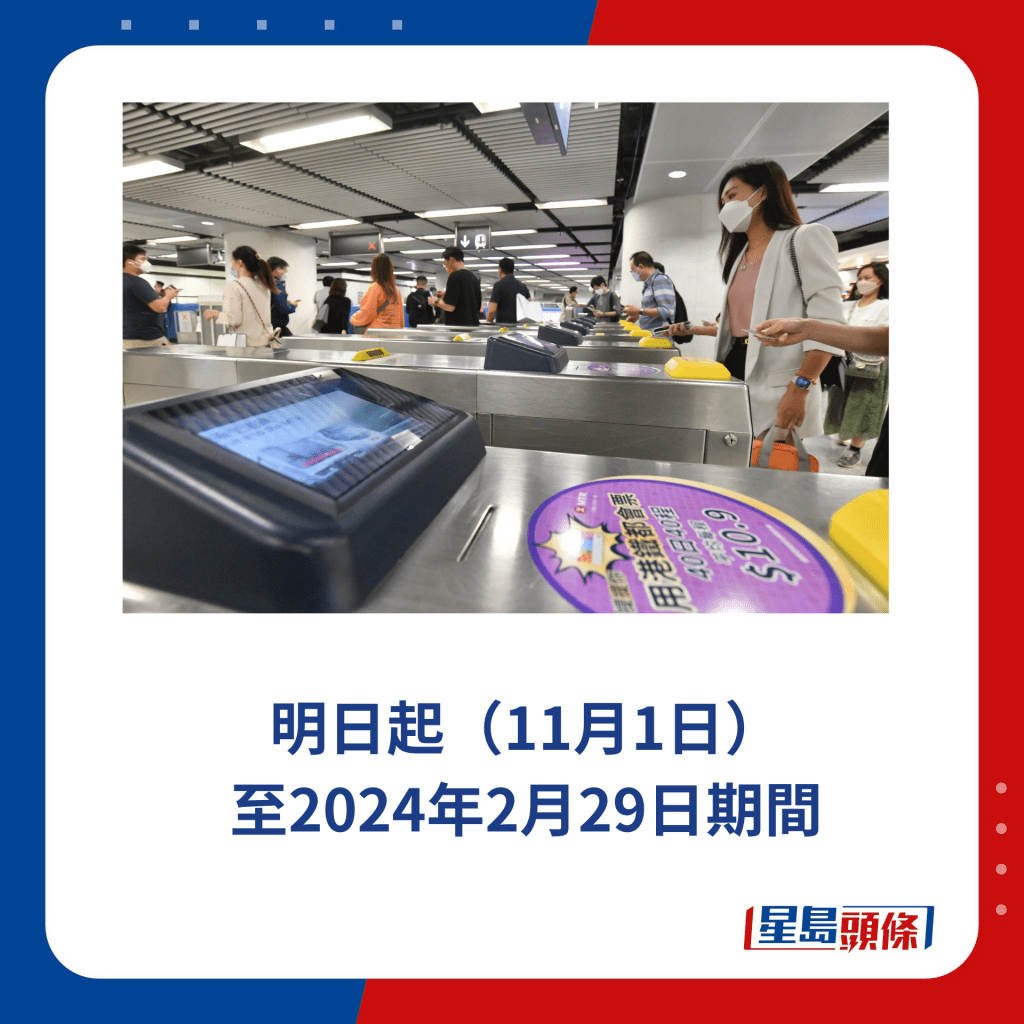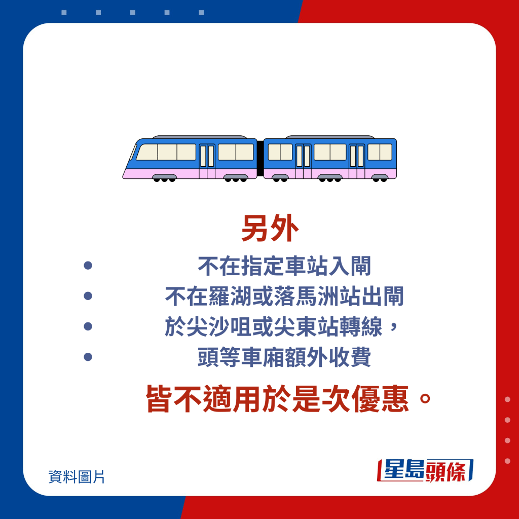 留意:不在指定車站入閘、不在羅湖或落馬洲站出閘、或于尖沙咀或尖東站轉線,以及頭等車廂額外收費,皆不適用于是次優惠。