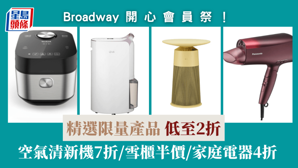 Broadway百老匯優惠|百老滙由即日至11月13日舉行為期一連11日的“Broadway 開心會員祭返黎啦”優惠,逾百款精選產品包括電視機、手提電腦、耳機、智能手機、Soundbar、空氣清新機、吸塵機、抽濕機及旅行用品等統統都有減價,部分低至2折發售,各位百老匯會員記得把握時間“掃平貨”!