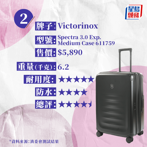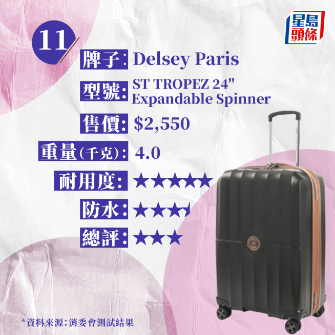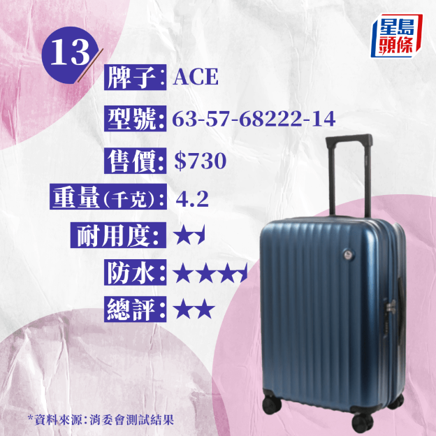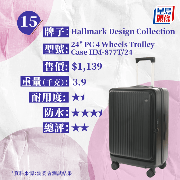 是次測試的15款樣本均為中型硬身行李箱,高度約24吋至28吋,屬于寄艙行李類別,全部配備可供海關人員以保安鑰匙打開檢查的TSA密碼鎖,外殼均由膠料制造,重量約由2.5千克至6.2千克,售價由730元至8,200元,相差逾10倍。