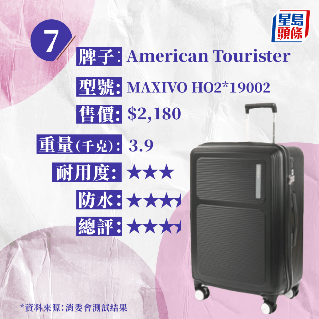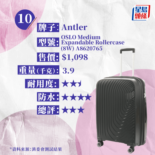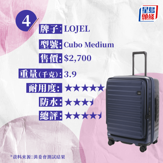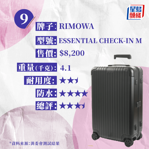 整體評分最高(4.5分)的4款樣本中,有2款售價為2,500元以下,分別為“Muji 行李箱連滑輪固定器75L”(約1980元)及“ECHOLAC AMOS PC232SA(24″)”(約2100元)。而售價最高的1款“RIMOWA ESSENTIAL CHECK-IN M”( 約8,200元),整體評分僅獲3.5分,特別在路面行走性能與拉桿強度方面,在行走路程未及 60公里時,拉桿手柄便斷裂,表現強差人意。