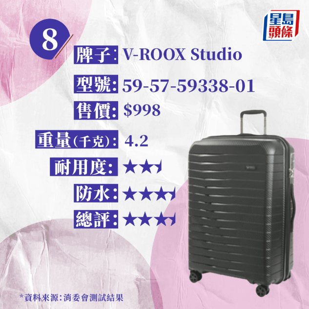 圣誕新年旅游旺季即將來臨,不少人會買行李箱準備外游。消委會測試15款中型硬身拉鏈式行李箱的耐用和化學安全程度,其中7款樣本經長距離拖行后,分別出現車輪脫落、箱身破裂、拉桿或拉桿手柄折斷、松脫等情況。售價最高的“RIMOWA ESSENTIAL CHECK-IN M”(約8,200元(港幣,下同)),整體評分僅獲 3.5 分,在行走路程未及 60公里時,拉桿手柄便斷裂。其中一款樣本的手挽有部分物料檢出的塑化劑含量超出歐盟REACH法規訂立的上限45倍,或會影響生殖健康。