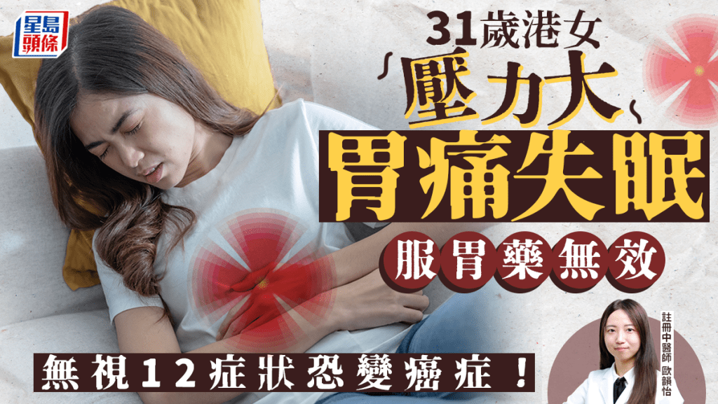 胃痛可大可??!注冊中醫師歐韻怡分享案例指,香港一名31歲女子受壓力影響,胃痛超過2年,服用胃藥后仍無助紓緩。她提醒,情緒會影響臟腑健康,如果未有妥善處理胃痛問題,恐有癌變風險,切勿忽略12種高危癥狀。