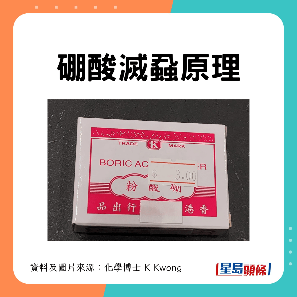 化學博士K Kwong日前在Facebook上撰文,講解滅虱方法,表示自己在深水埗買到最便宜的滅虱藥“硼酸”(Boric Acid),售價只須3元。他解釋指,硼酸是一種固態的酸,而市面上賣幾百元一枝的滅蟲藥“硼酸鹽”,其實就是硼酸的水溶液。