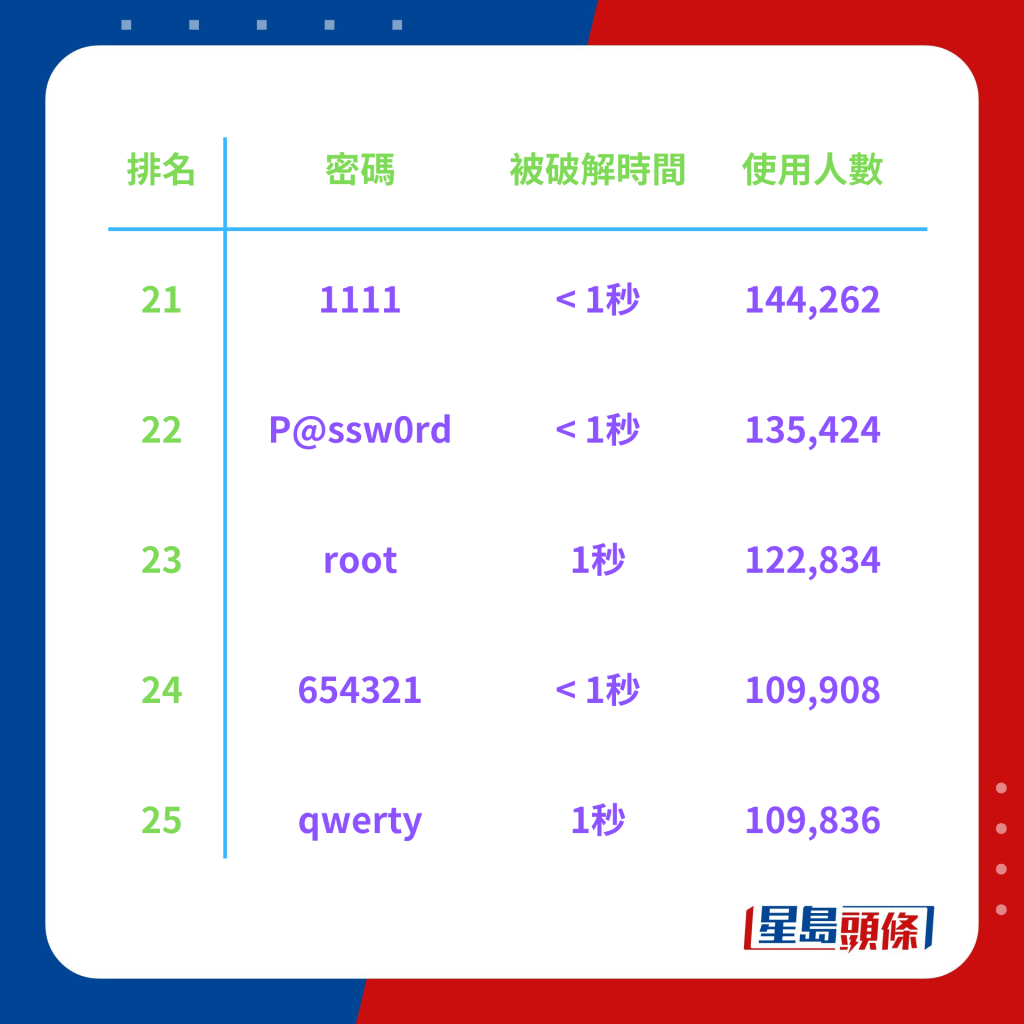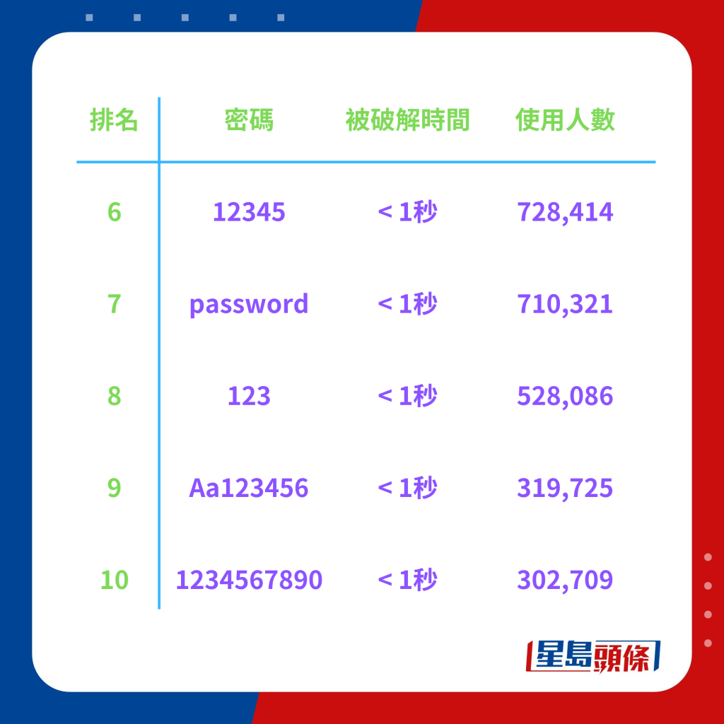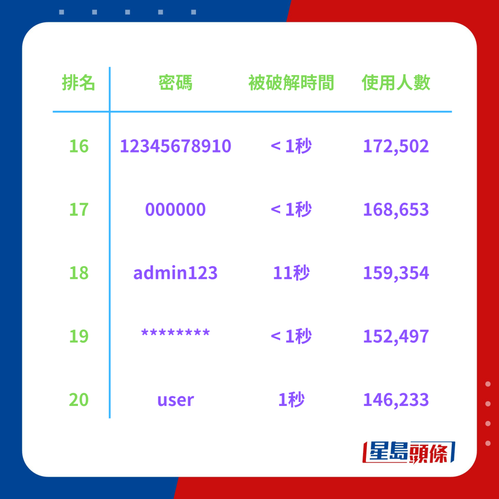 近年網絡騙案猖狂,除了需要時刻保持警覺外,更應該加強保護個人賬戶的安全,例如設置較高強度的密碼,避免黑客有機可乘。 由Nord VPN推出的密碼管理工具Nord Pass于日前發布了”全球200大常用密碼排行榜”,當中有超過7成的密碼被黑客秒速破解,最常見的密碼更多達450萬人使用,可見帳戶安全問題存在過多的隱憂。