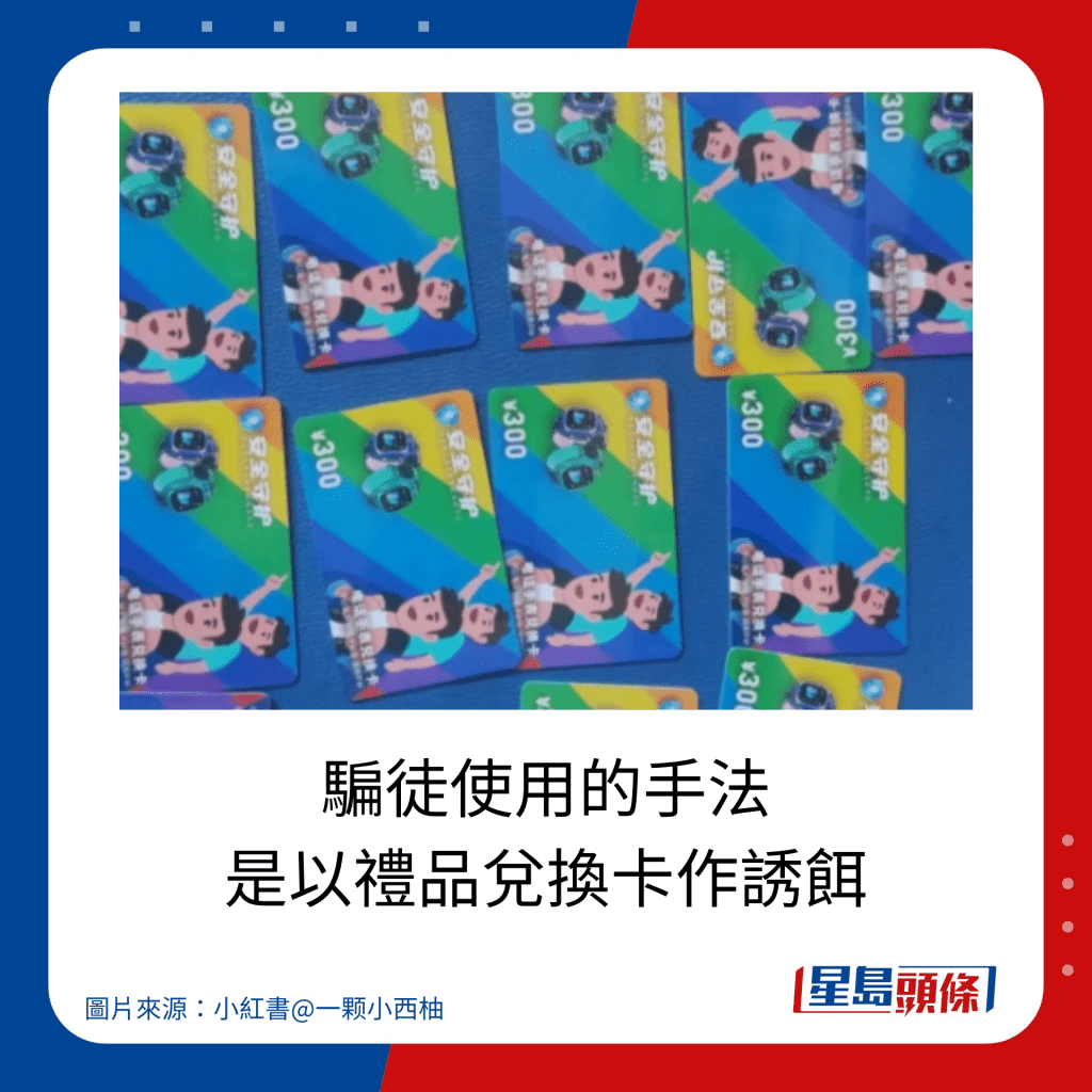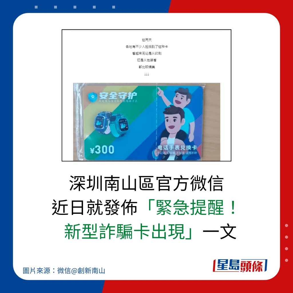 深圳南山區官方微信昨日(11月19日)發出“緊急提醒”文章,指市面出現了“新型詐騙卡”。 近日陸續有市民在街頭巷角撿獲一款禮品卡,禮品卡面值人民幣 ¥300,可兌換“防走失兒童定位智能電話手表”。 卡上表明是“不記名 可轉贈”,只要執拾到就有資格使用。 禮品卡表面看起來可信度甚高,但經官方查證,禮品卡是騙徒的誘餌。