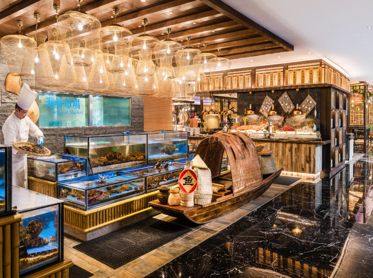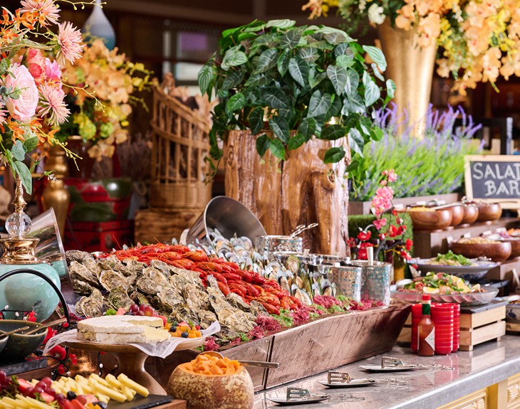 酒店自助餐招牌之一的旋轉木馬造型轉盤放滿精致甜品,包括法式馬卡龍、焦糖布丁和葡式木糠布丁。廚師們會在現場即席烹飪新鮮食材,為食客打造猶如觀看劇場表演的用餐體驗。