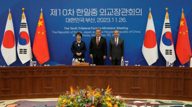 ▲當地時間2023年11月26日,中共中央政治局委員、外交部長王毅在韓國釜山同韓國外長樸振、日本外相上川陽子共同出席第十次中日韓外長會。 美聯社