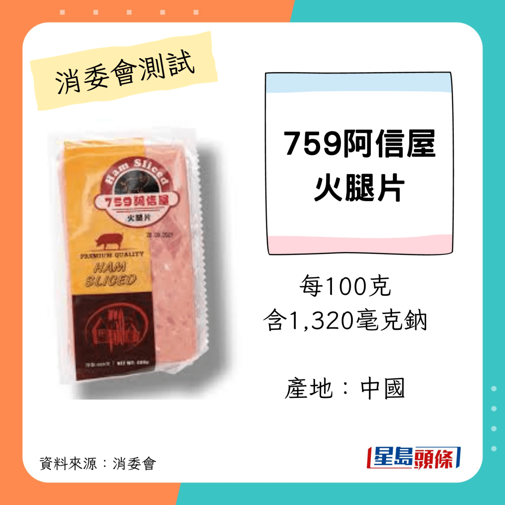 • 火腿鈉含量最高:“759阿信屋”火腿片(每100克含1,320毫克鈉)