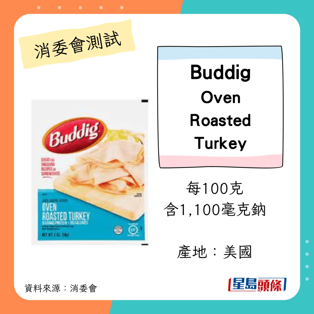 • 火雞片鈉含量最高:“Buddig”Oven Roasted Turkey(每100克含1,100毫克鈉)
