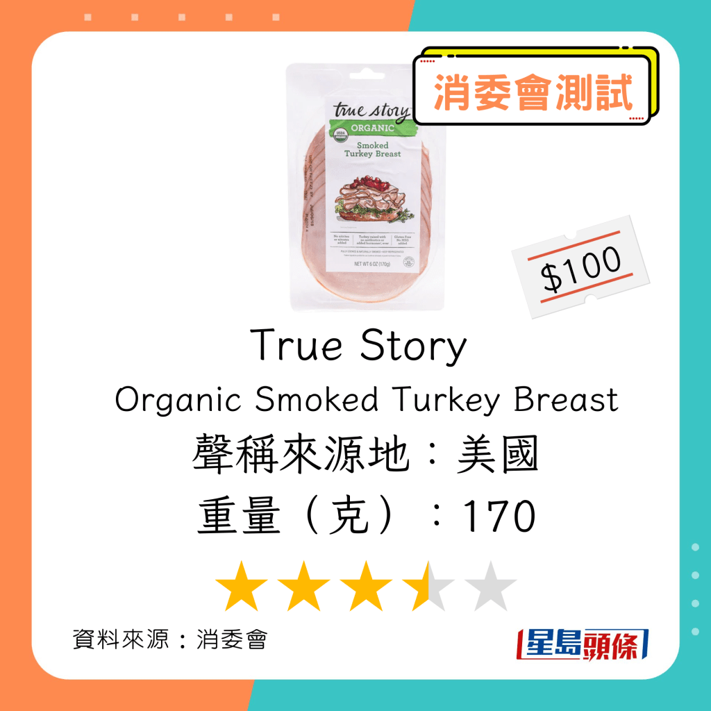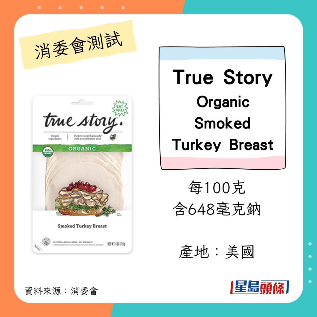• 火雞片鈉含量最低:“True Story”Organic Smoked Turkey Breast(每100克含648毫克鈉)