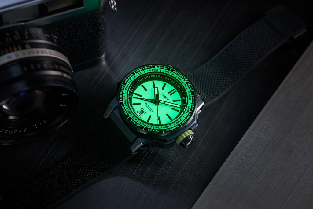 夜光除了應用在指針和時刻上,還可以應用在很多地方。 Ztage以北極光為設計主題的Hybrid Off Ground Aurora,不但采用全夜光表盤,設有全球24個時區代表城市名稱的藍寶石表圈都有全夜光顯示,表冠也有顆夜明珠,腕表在夜晚發光的效果,也真如北極光般吸引。
