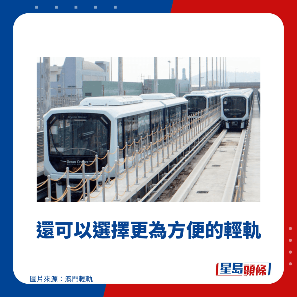自澳門輕軌凼仔線于2019年開通后,到澳門旅游除了乘搭陸的士和巴士等交通工具外,還可以選擇更為方便的輕軌。輕軌路線穿梭澳門各大熱門景點,如官也街、新濠影匯和威尼斯人等,車廂更采用全景透明玻璃,乘車時可將窗外怡人景色一覽無遺。