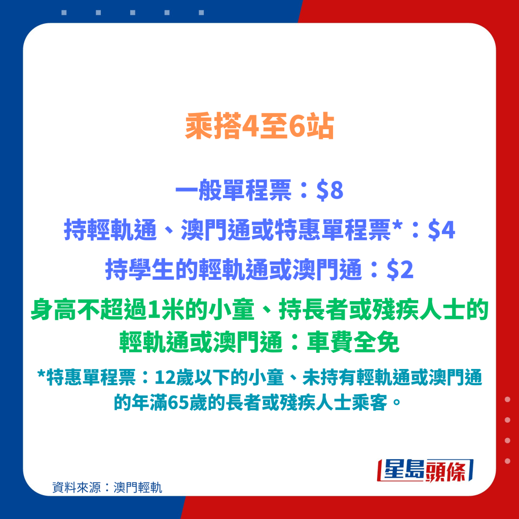 將于12月8日通車的全新跨海段更將列車服務延伸至媽閣站,只須5分鐘的時間就可經跨海隧道直達澳門半島,相當快捷。此外,車站出口更連接了媽閣廟、澳門海事博物館等地標,旅客可以盡情暢游澳門。而輕軌的票價按乘搭站數計算,一般由$6-$12不等。