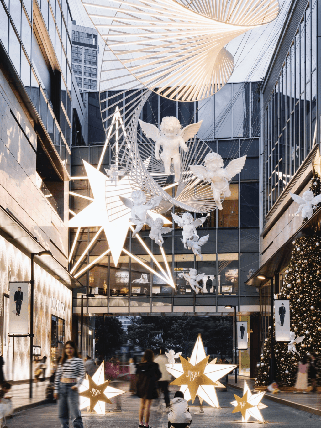 深圳灣萬象城是深圳最早布置圣誕裝飾的商場之一。 以Jingle Bay為主題,商場在時尚大道,設有一棵12米高的巨型圣誕樹,樹上白色、金色的圣誕波裝飾,加上大大小小的天使寶寶,充滿冬日溫馨的感覺。 整條時尚大道更掛起浪漫的星光布置,配上在天上高高低低飛翔的白色天使,每日下午5點亮燈后,更是夢幻十足; 至于在商場內的Bay Plaza,圣誕樹配搭在樓梯間玩耍的貓咪擺設,可愛度爆燈,加上飄雪效果,感覺就似置身北歐小鎮。