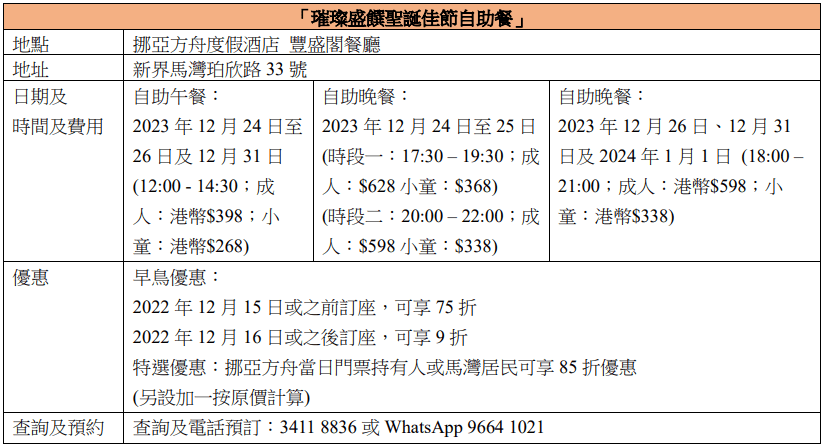 挪亞方舟度假酒店 豐盛閣餐廳—璀璨盛饌圣誕佳節自助餐—圣誕自助餐原價及優惠。
