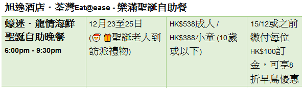 旭逸酒店. 荃灣 Eat@ease圣誕自助餐原價及優惠。