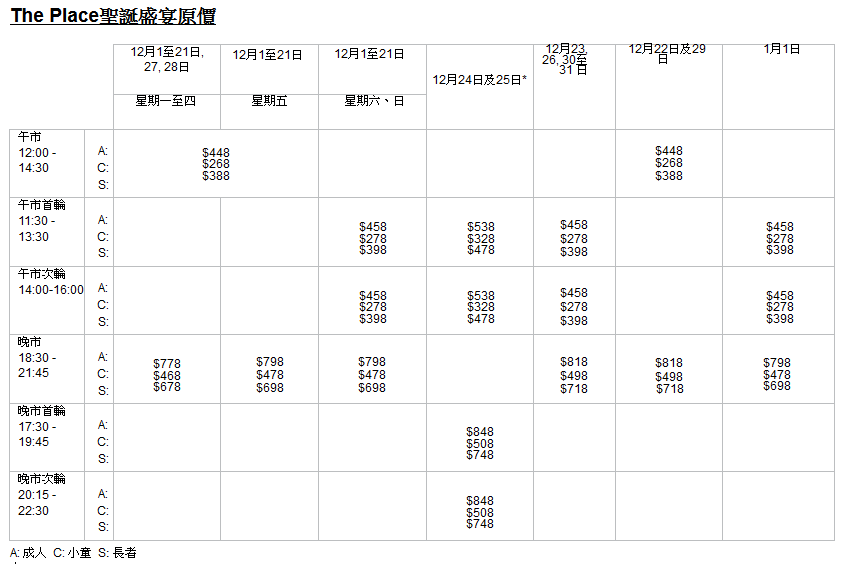 圣誕自助餐原價:自助午餐/成人$613起,自助晚餐/成人$877.8起