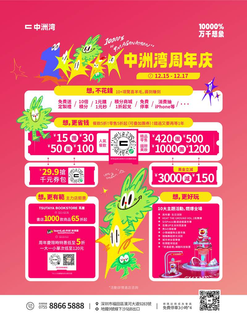 中洲灣隨處可見科技狠活,不僅有占地3000㎡的潮玩店、華南首家 “蔦屋”、teamLab共創!未來園,還有遍地的藝術品,彷佛打造了一座全新的 “未來城市”。今年中洲灣周年慶更是 “卷翻天”,不僅現場有10大主題活動,一次性玩到爽!還額外送出10多項驚喜羊毛:1元購1元秒、餐飲/零售5折券等等,省錢更不花錢!