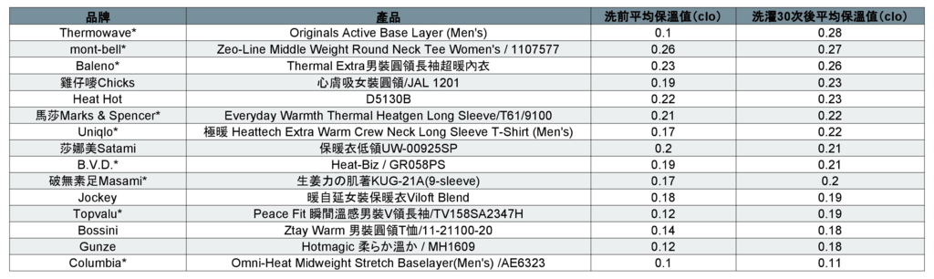 測試中,消委會模擬用家在整個冬季穿著樣本30次,再測量其布料的熱阻。當中15款產品均被證實會愈洗愈暖,其中6款甚至可比未洗前暖2成;只得一款的保溫值比之前明顯下降,如Baleno的樣本于洗濯前平均保溫值(clo)為0.23,而洗濯后的平均保溫值(clo)為0.26;Uniqlo “Heattech”則由洗濯前平均保溫值(clo)為0.17clo,于洗濯后的平均保溫值(clo)升至0.22;