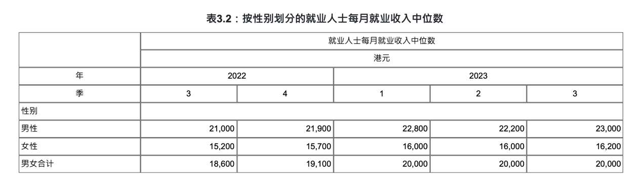 ▲按性別劃分的就業人士每月就業收入中位數。圖源:香港特別行政區統計處