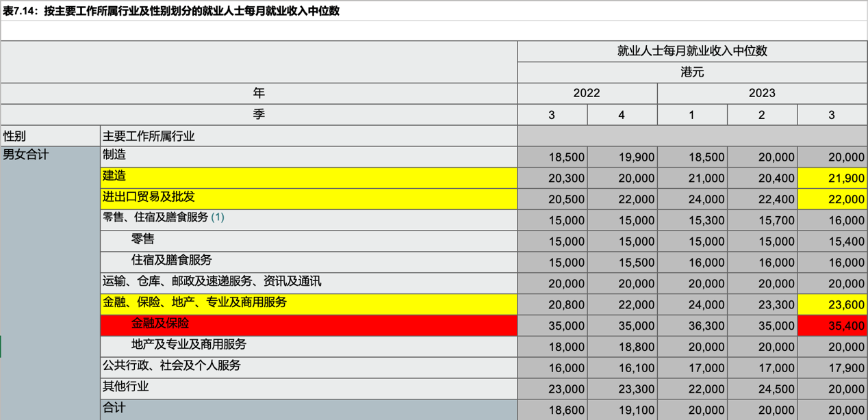 為留住人才,香港企業也是不遺余力,最直接的就是漲工資!據最新香港《綜合住戶統計調查按季統計報告》顯示,2023年第3季度,香港打工人每月就業收入中位數為2萬港元(約1.82萬人民幣),比去年同期增長約7.5%;7大行業打工人月收入中位數超過2萬港元的分別為“建造”、“進出口貿易及批發”和“金融、保險、地產、專業及商用服務”,“金融及保險”月收入中位數甚至高達3.54萬港元(約3.23萬人民幣)!其中建造、金融是港漂工作首選。