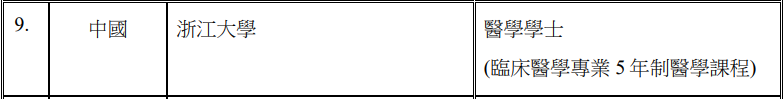 今年港府公布第4批承認醫學資格的名單,其中有7項醫學資格來自內地學校,加上過去批次,共有6所內地大學獲承認資格,分別是復旦大學、上海交通大學、中山大學、清華大學、浙江大學和武漢大學。