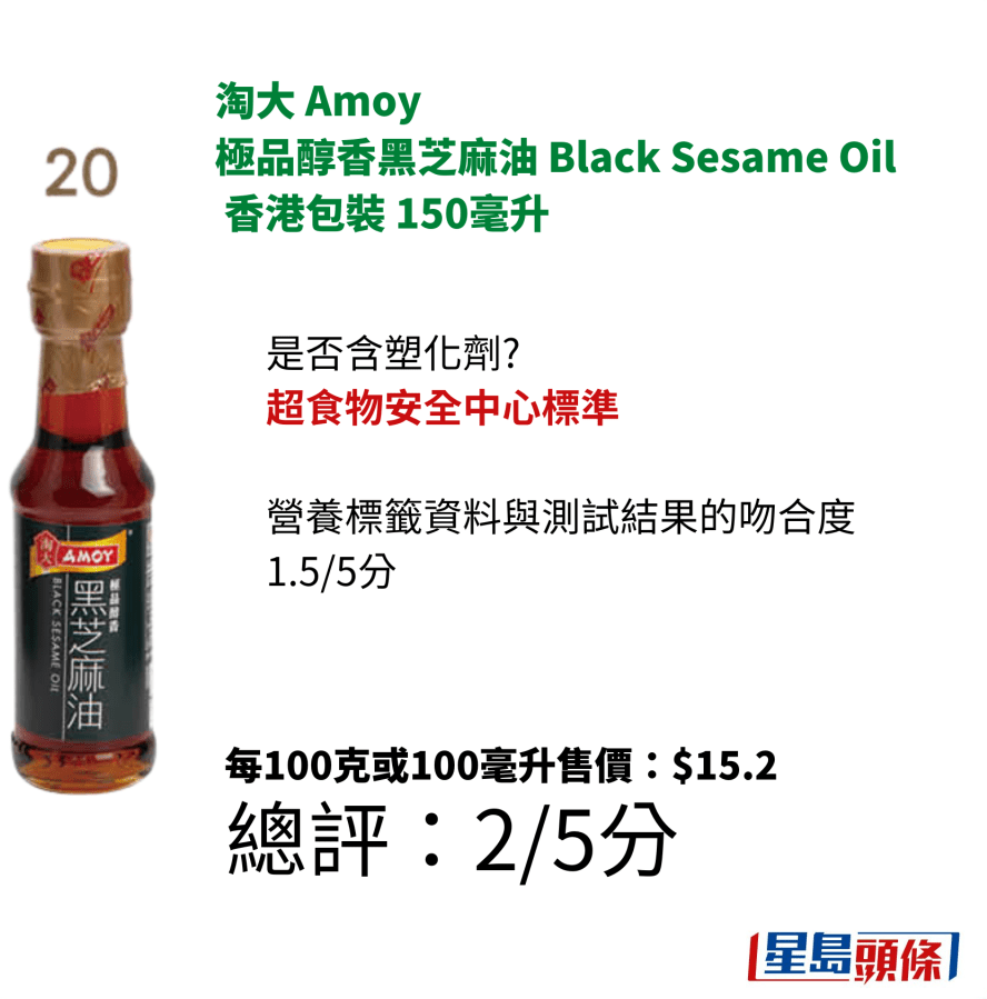 35款芝麻產品樣本中包括20款芝麻油、10款芝麻粉和5款芝麻醬。這些樣本被測試塑化劑、除害劑和營養素的含量,同時也測試芝麻油樣本中的污染物含量,以及芝麻粉和芝麻醬樣本中的霉菌毒素和致病菌含量。各個品牌的價格相差極大,以芝麻油為例,每100克的價格從11.9元到68.7元不等,相差超過4倍半。有趣的是,價格最高和最低的樣本在整體評分上都獲得了最高的5分,這表明價格和產品質素之間并沒有必然的關聯。