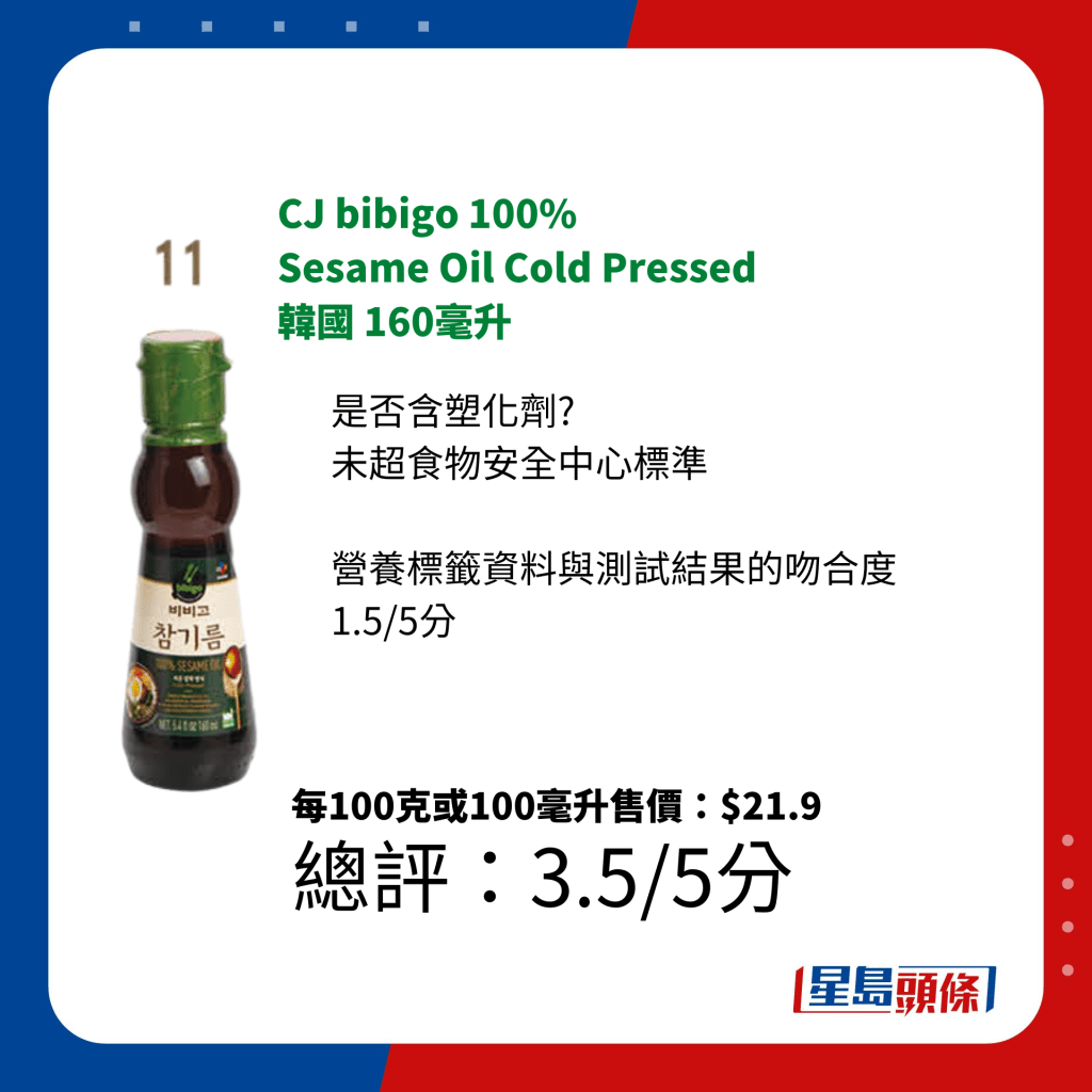 7款樣本包括“CJ bibigo” 100% Sesame Oil Cold Pressed、“不倒翁 ” Sesame Oil、 “白雪 ”香濃麻油、“義香” 純正蔴油、“東和” 冷壓初榨黑芝麻油、“胡振興”頂烏蔴油和“淘大” 極品醇香黑芝麻油的反式脂肪酸 的測試結果不達標示為“0”的定義。以上 相關的樣本資料已經轉交食安中心跟進。 營養標簽的資料錯誤有機會誤導消費者選購不合適的產品,特別是對患有長期病患 例如心臟病及糖尿病的人士影響尤甚,消委會將促請生產商及代理商正視及改善問題。