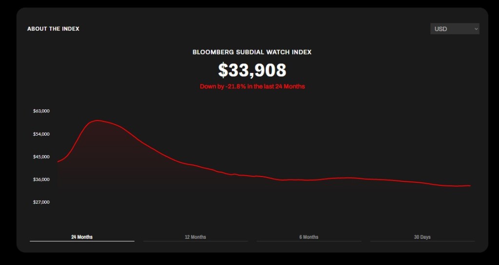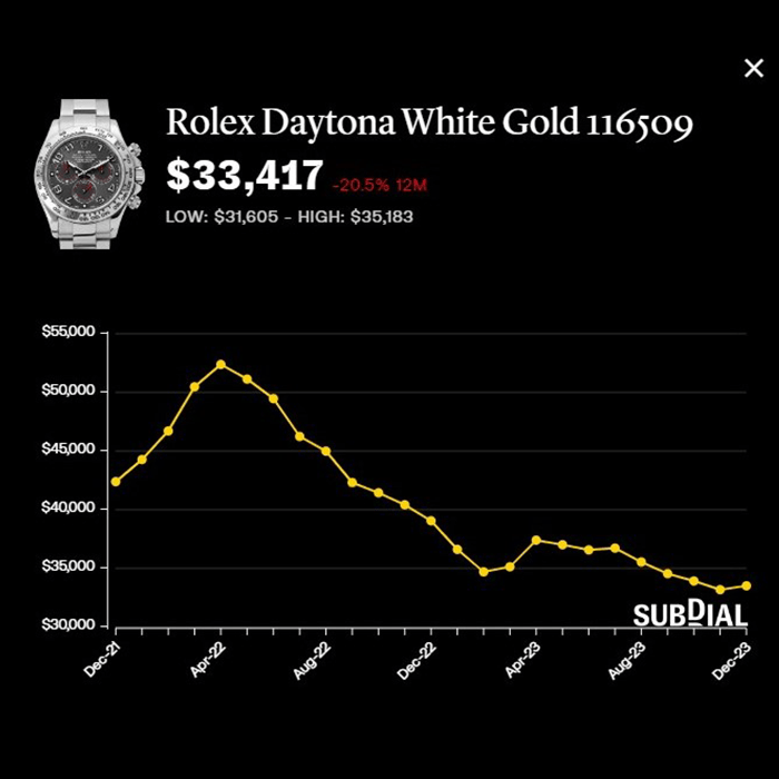 Subdial表示,疫情期間,手頭充裕、足不出戶的消費者在網絡上搶購高檔手表,導致市場對瑞士頂級二手名表的需求激增,交易價格節節攀升。然而隨著利率增加,借貸成本上升,瘋狂搶購的現象才稍為平息,但也擊退了投機資產的需求,二手名表價格即應聲下滑。