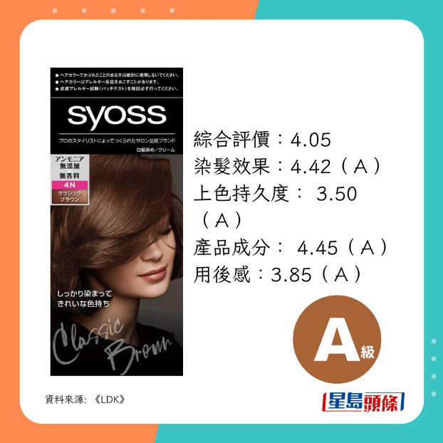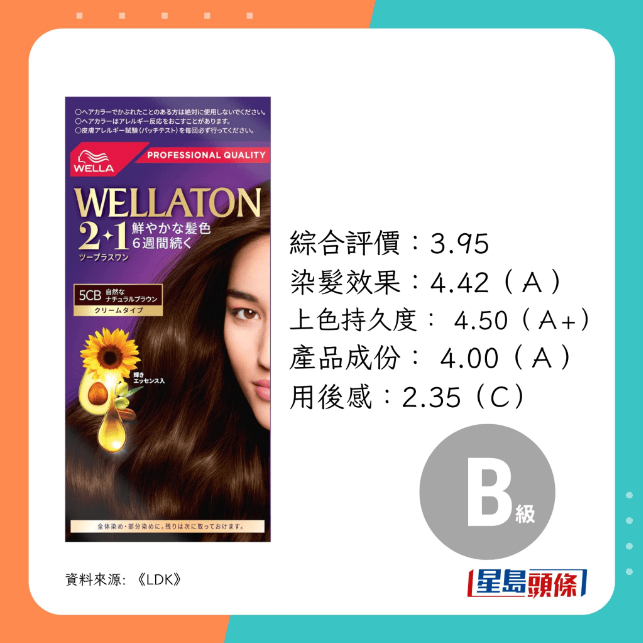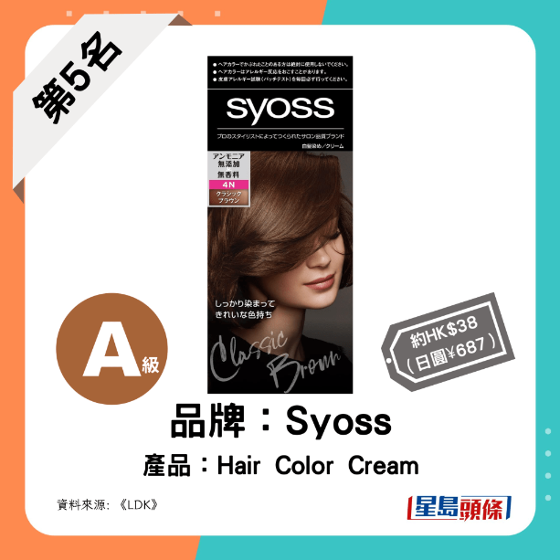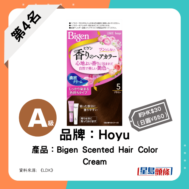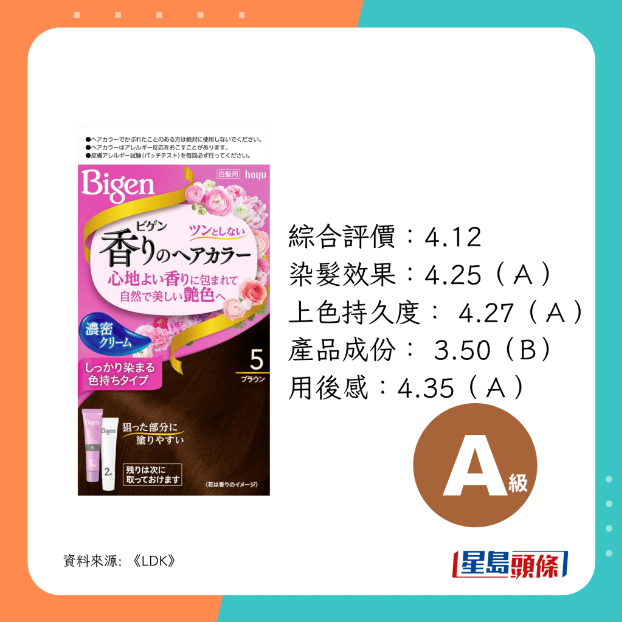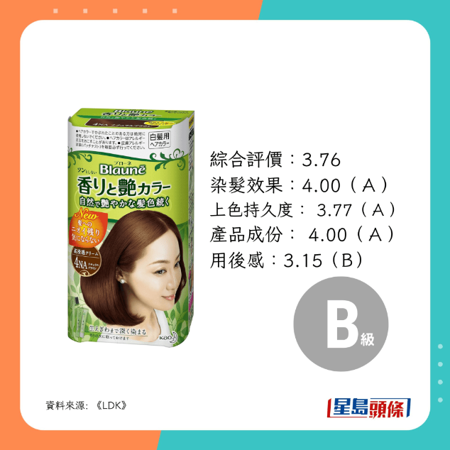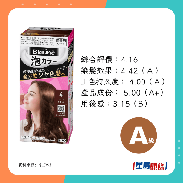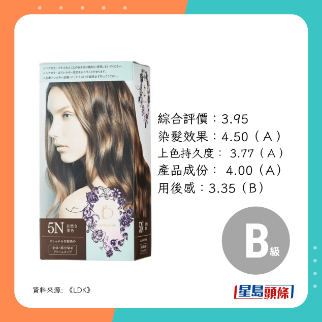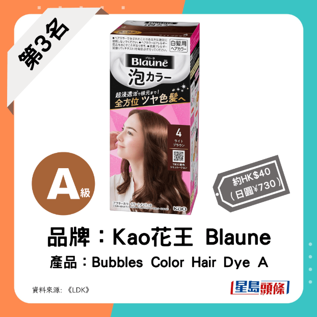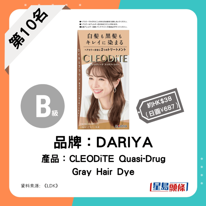 根據《LDK》白發專用染發劑的評測結果,10款染發劑之中,有5款相對出色,獲評為A級,不但染色能力佳、持久度高、含有修護頭發的成分,而且易于使用。 排名如下(由低至高):
