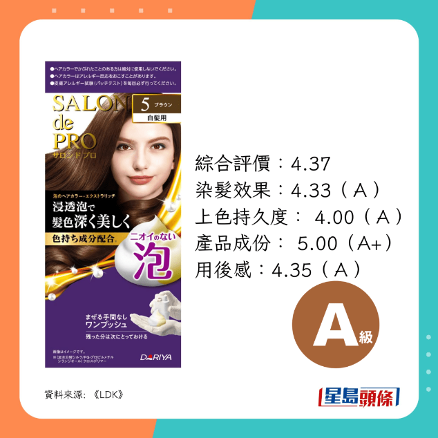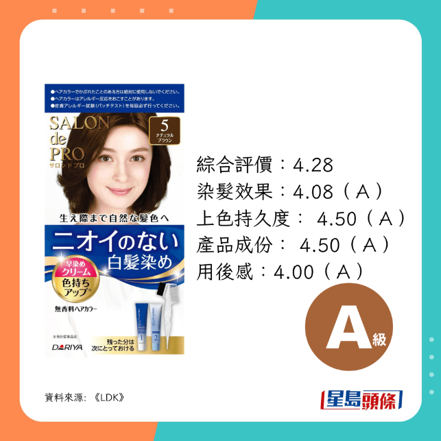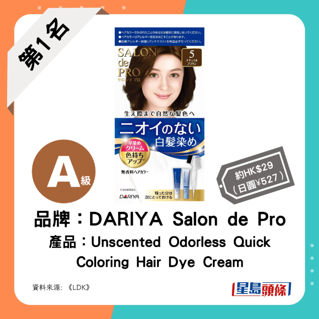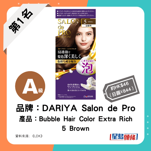 這次《LDK》測試中,最獲推介的A級的白發專用染發劑同樣為“DARIYA”品牌的產品,分別為“Salon de Pro Bubble Hair Color Extra Rich”及“Salon de Pro Unscented Odorless Quick Coloring Hair Dye Cream”。 兩款產品不但含多種滋潤和修復頭發的成分,而且使用方便簡單、上色持久度高。