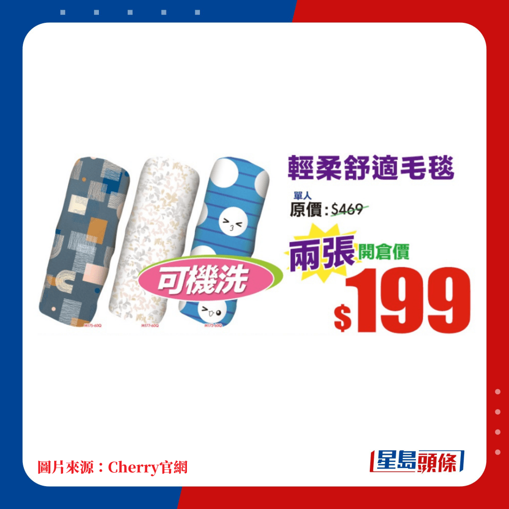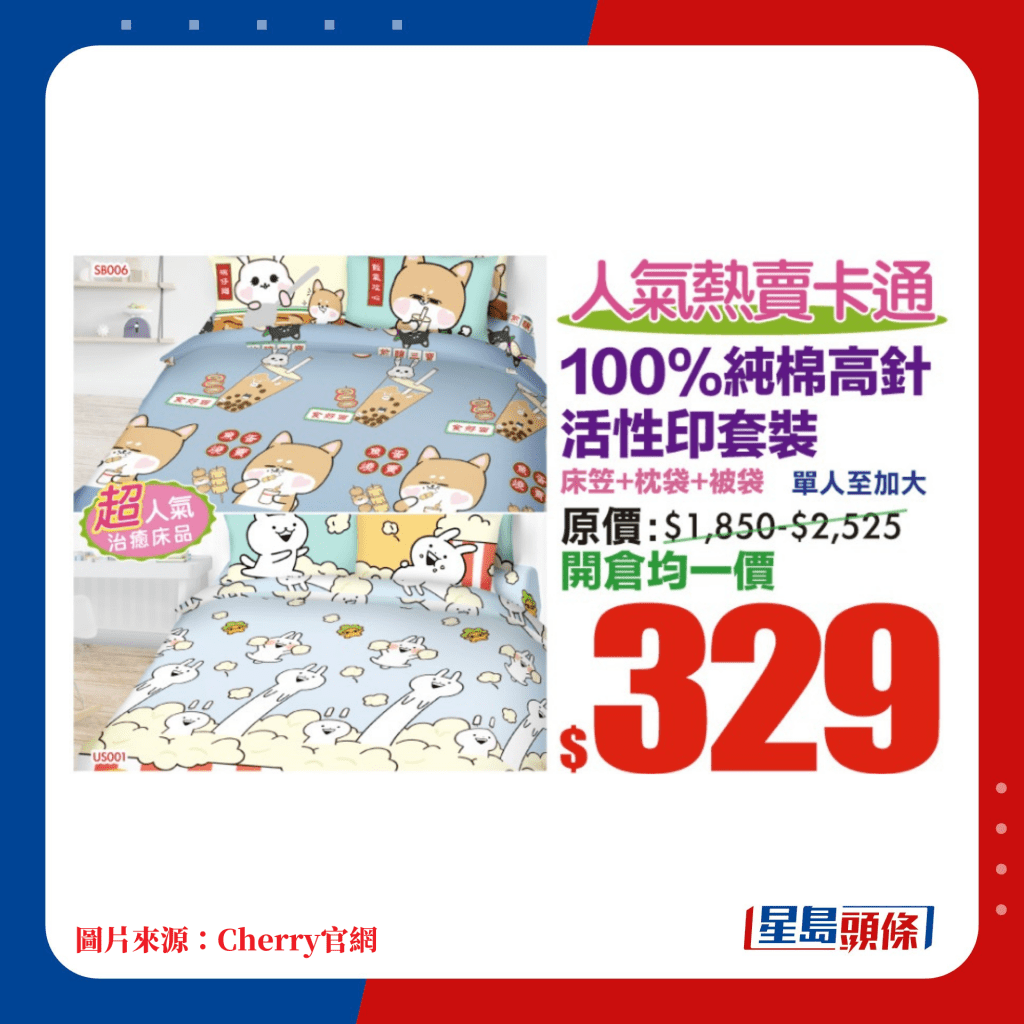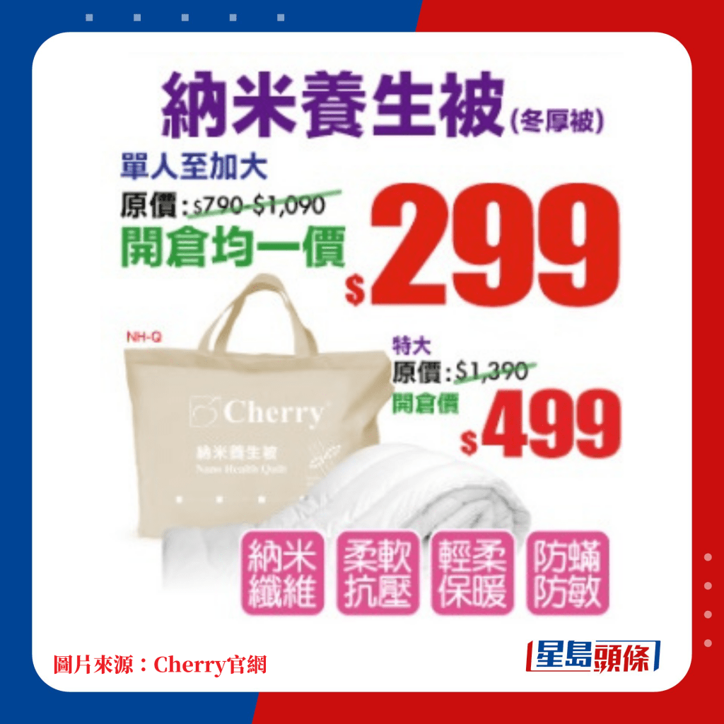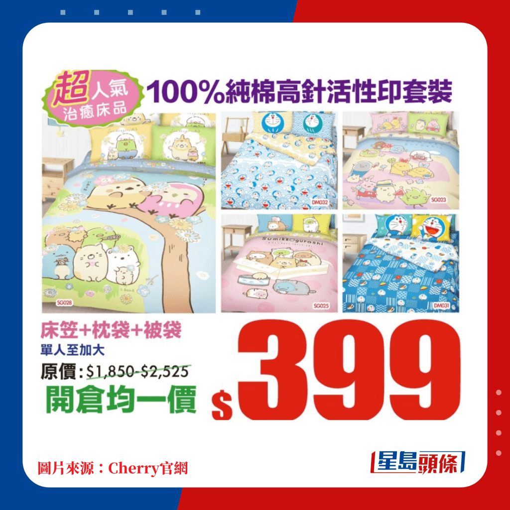 由即日起至明年2月19日,多款Cherry精選床上用品都有減價優惠。當中精選推介100%純棉床笠連枕袋套裝,單人至加大尺寸只售$99起; 至于床笠、枕袋及被袋3件套裝,全尺寸均一價$329。深受小朋友歡迎的卡通系列包括人氣的角落小伙伴、多啦A夢各款毛毯、床品3件裝,只售$199起。最近天氣轉冷,或許需要添置多一張暖笠笠被鋪,Cherry開倉減價被子包括各款的羊毛被、感溫被、養生被、羽絨被等,售價由$299起,其中100%純羊毛被由單人至加大尺寸,均一價只售$499,實是冬日抵買佳品。