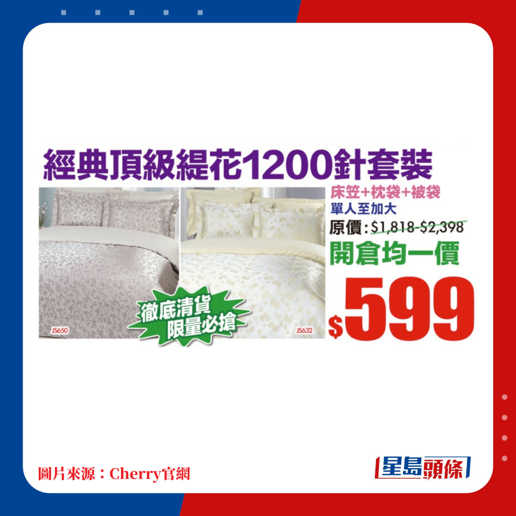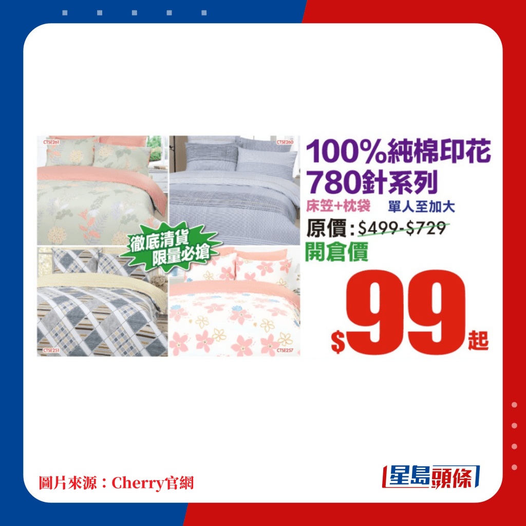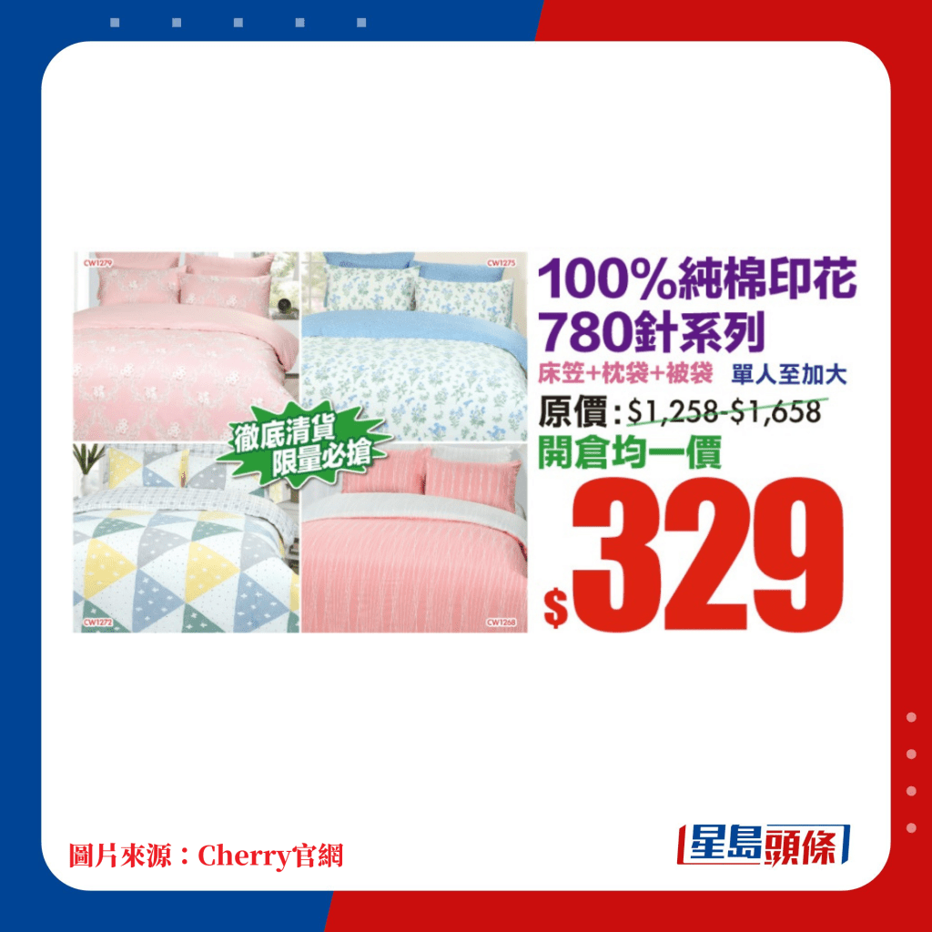 Cherry床品開倉|床上用品品牌Cherry由即日起至2024年2月19日進行開倉大優惠,多款床上用品包括床笠、被袋、枕袋大減價??ㄍ兠薷哚樆钚杂?件套裝均一價$399,床笠及枕袋$99起,冬日必備的100%純羊毛被開倉均一價$499,溫暖羽絨被劈價至3折,把握機會入手度過暖笠笠冬天!
