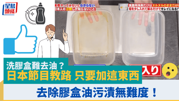 到底如此神奇的去油大法,是基于什么原理呢? 《日本人の3割しか知らないこと》節目組解釋,由于膠盒的油污漬會在膠盒的微小凹凸位置積聚,而鹽粒就可以將積聚在縫隙的油份通通帶走,令食物盒表面不再油膩!這個方法既環保又實用,而且非常劃算,使用便宜的鹽粒就能減少洗潔精的容量,快點把秘技分享給負責洗碗的家人朋友!