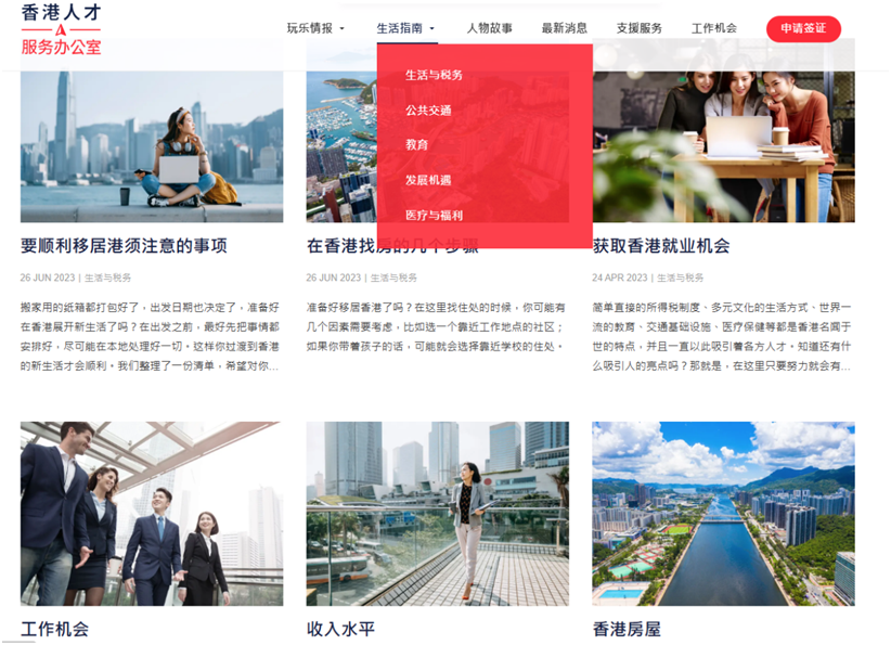 香港的高薪酬、國際平臺吸引了不少內地人前往。為幫助人才抵港后更快適應生活和投入工作,香港政府在2022年12月28日推出“香港人才服務窗口”,為有意到港的外來人才提供專設的一站式平臺,這個“窗口”,能讓剛到港的你輕松找到香港生活、就業、游玩、租房等多方面的資訊及支援服務。