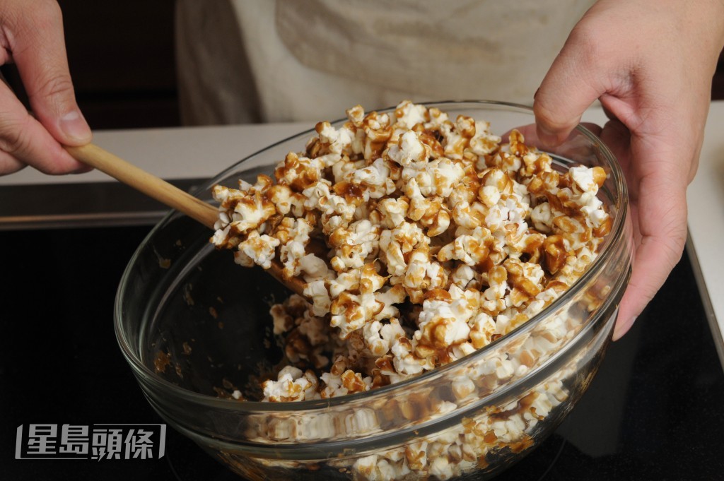 3. 熱糖漿淋在爆谷上,撒上即食腰果及拌勻。