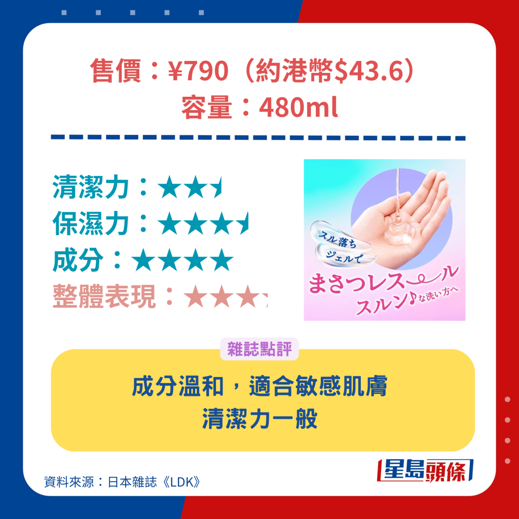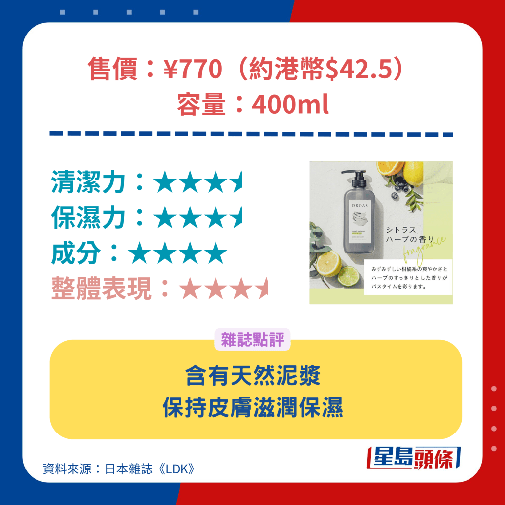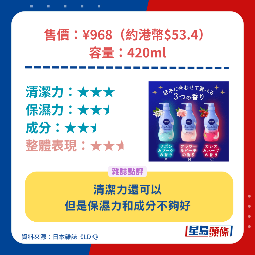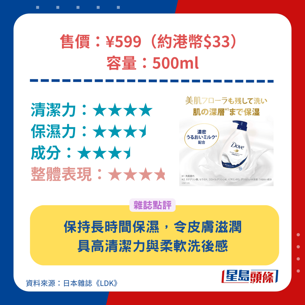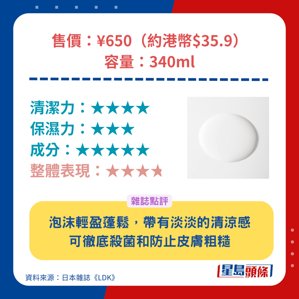 日本雜志《LDK》邀請多名用家實測及使用專業儀器測量17款平價沐浴露,其中包括在香港常見的Dove、樂敦、NIVEA、B?iore等品牌。評測中有3款產品獲A級評分,而位列榜首,達高效除菌的沐浴露更低至650日元(約33元人民幣)。