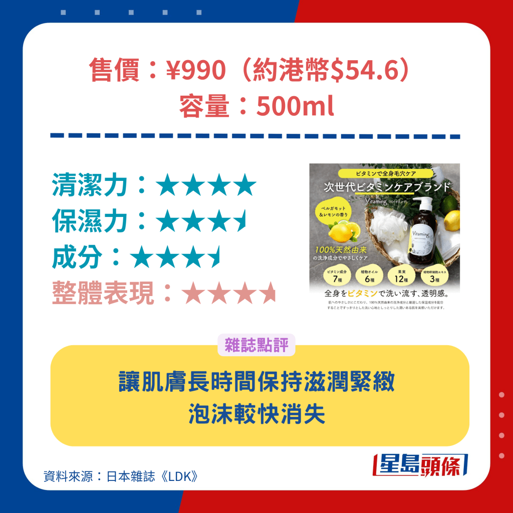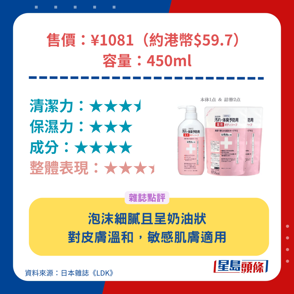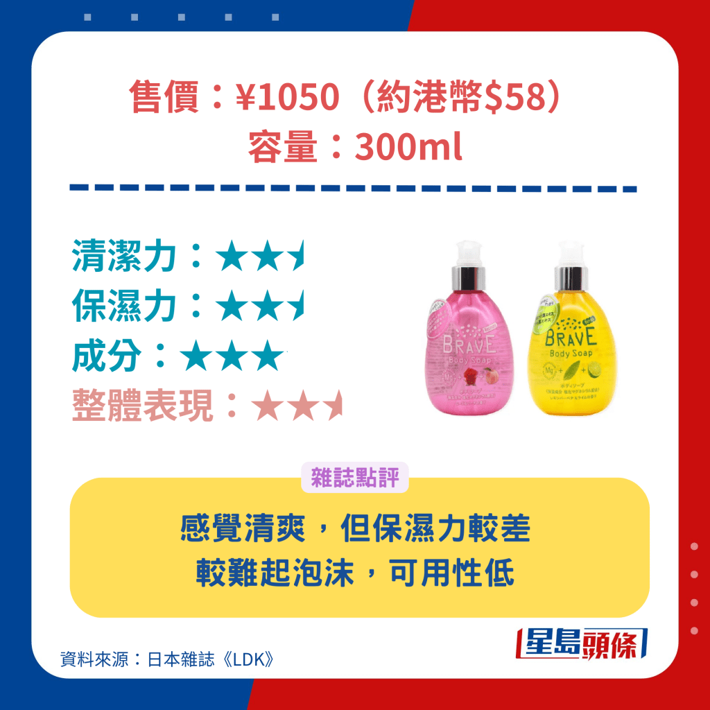 日本知名家品雜志《LDK》就清潔力、保濕力以及成分3大評分準則,評測巿面上17款平價沐浴露。
