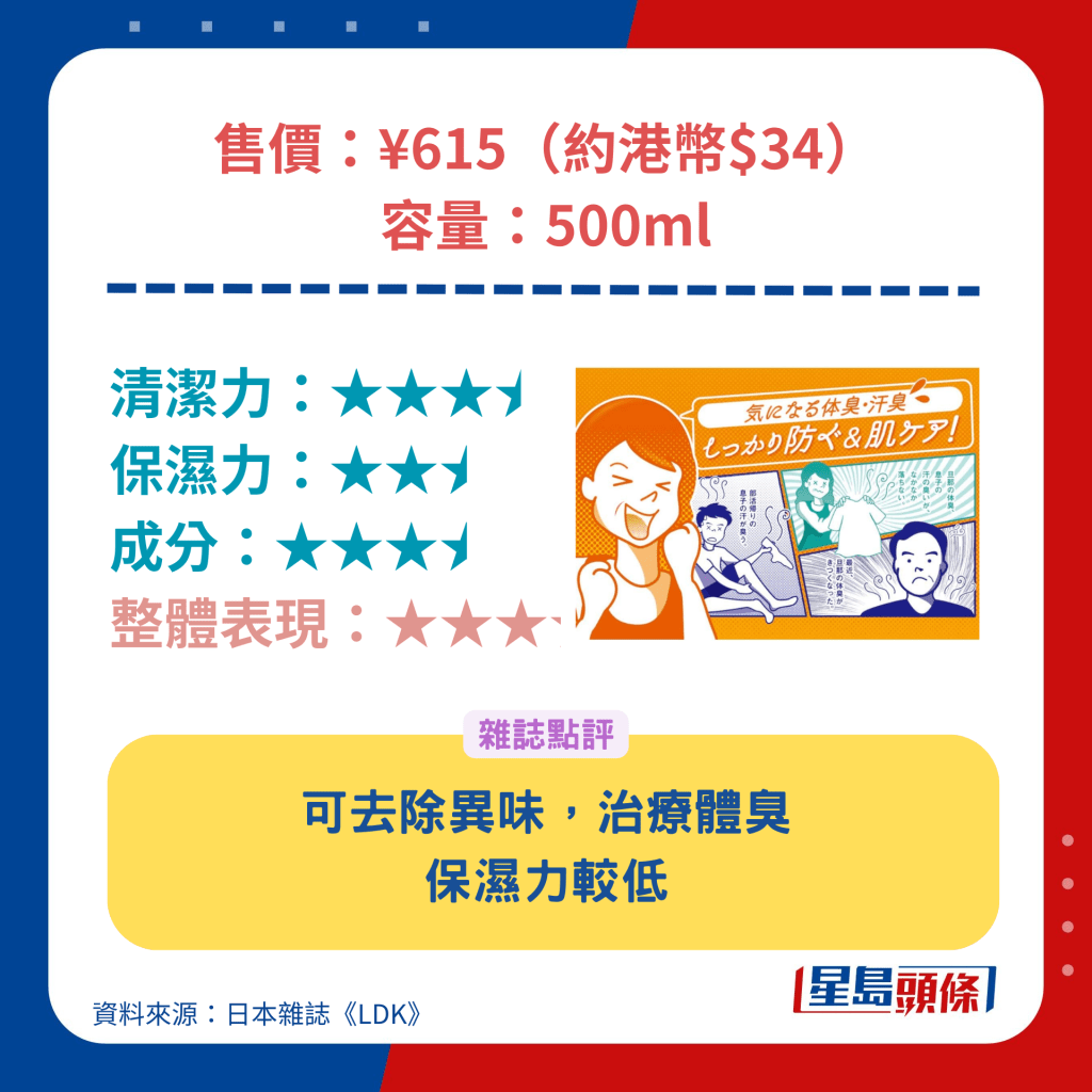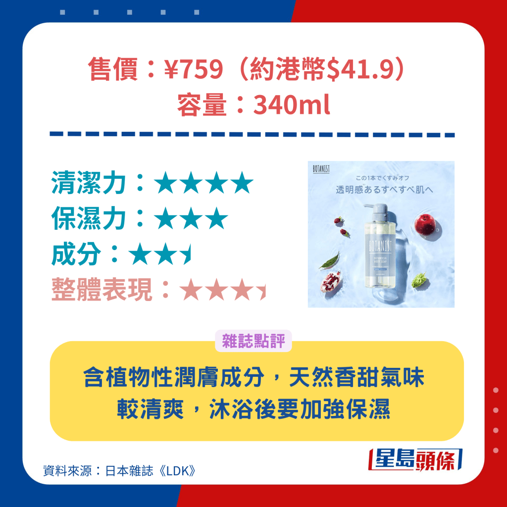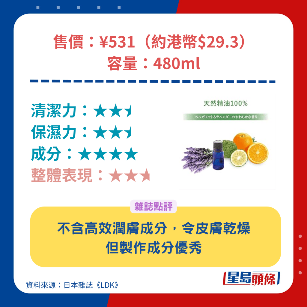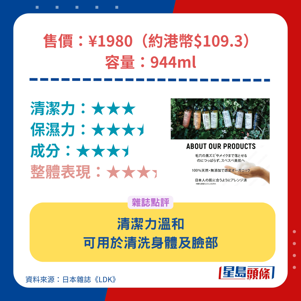 日本知名家品雜志《LDK》就清潔力、保濕力以及成分3大評分準則,評測巿面上17款平價沐浴露。