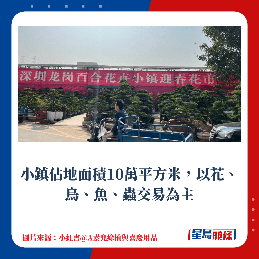 小鎮占地面積10萬平方米,以花、鳥、魚、蟲交易為主,小鎮內有不同市場,包括盆栽批發區、鮮花批發區、瓷器批發區、園藝產品交易等。