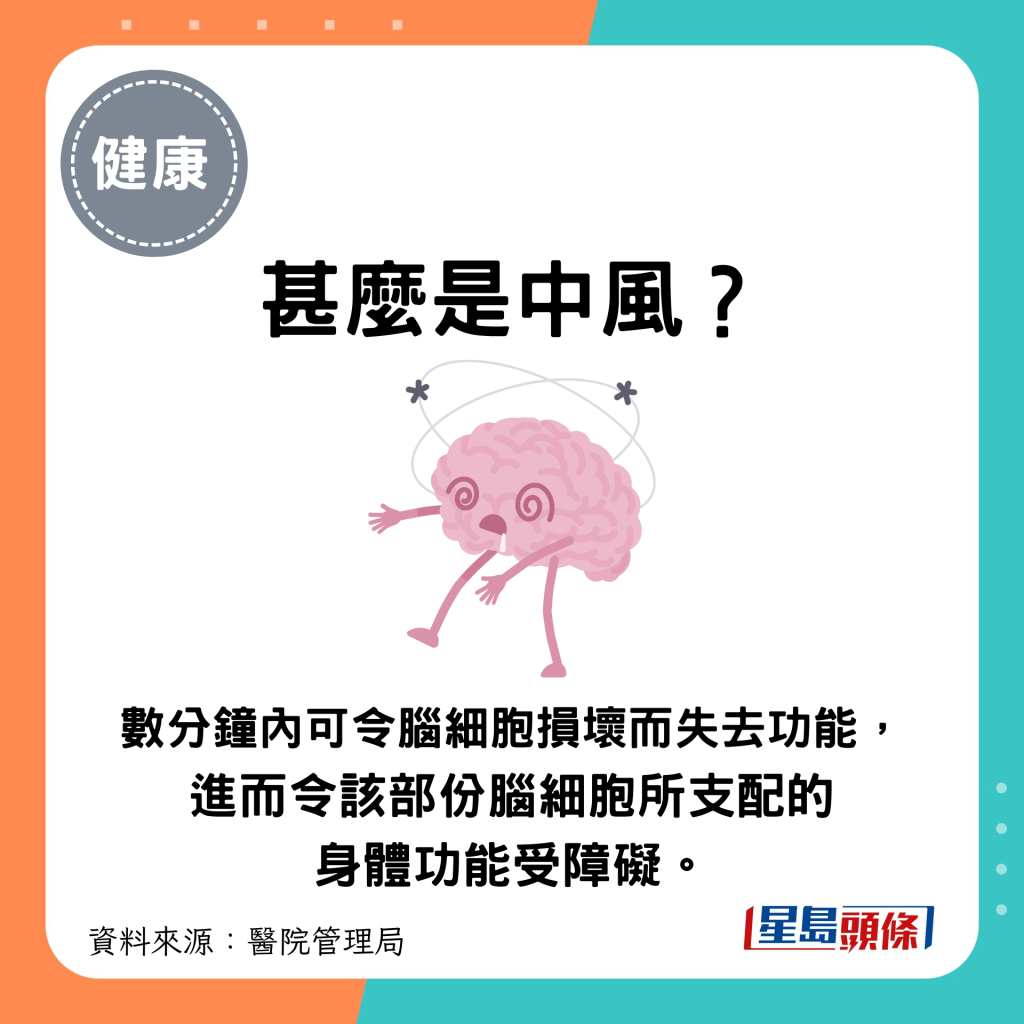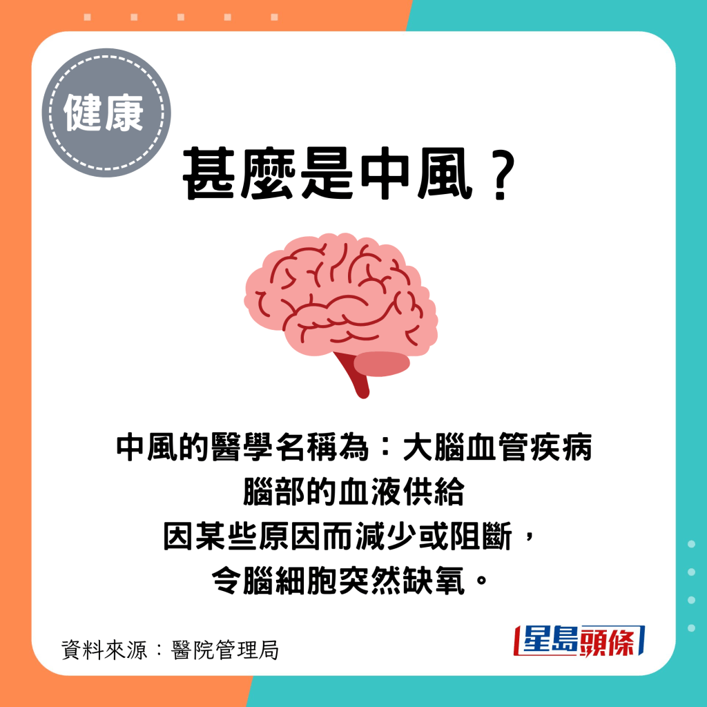 甚么是中風? 中風的醫學名稱為“大腦血管疾病”。 腦部的血液供給因某些原因而減少或阻斷,令腦細胞突然缺氧。