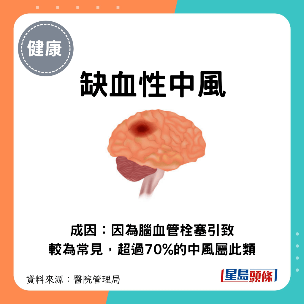 缺血性中風:因腦血管栓塞引致,這情況較為常見,超過七成的中風屬此類。
