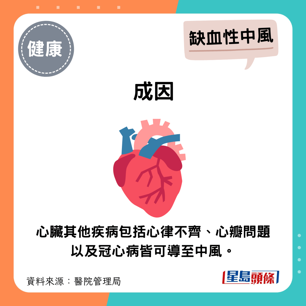 心臟其他疾病包括心律不齊、心瓣問題以及冠心病皆可導至中風。