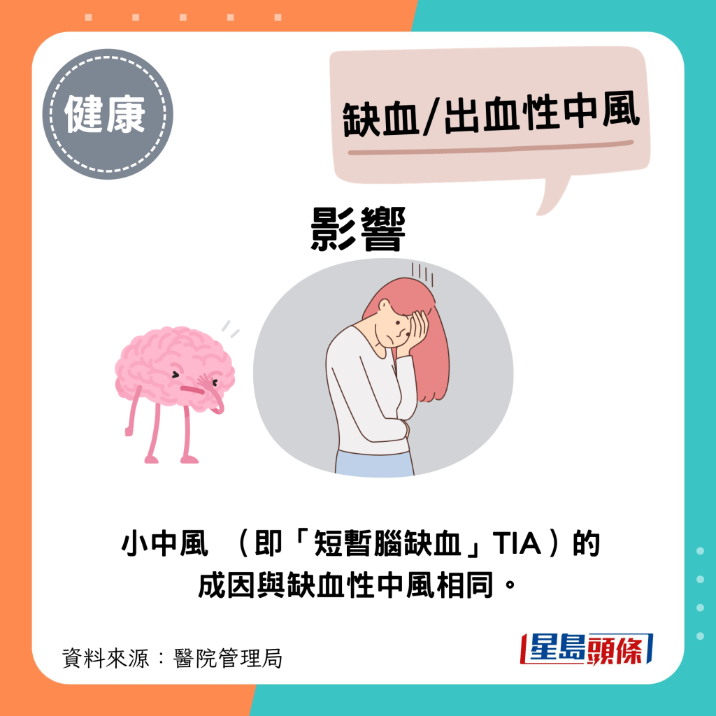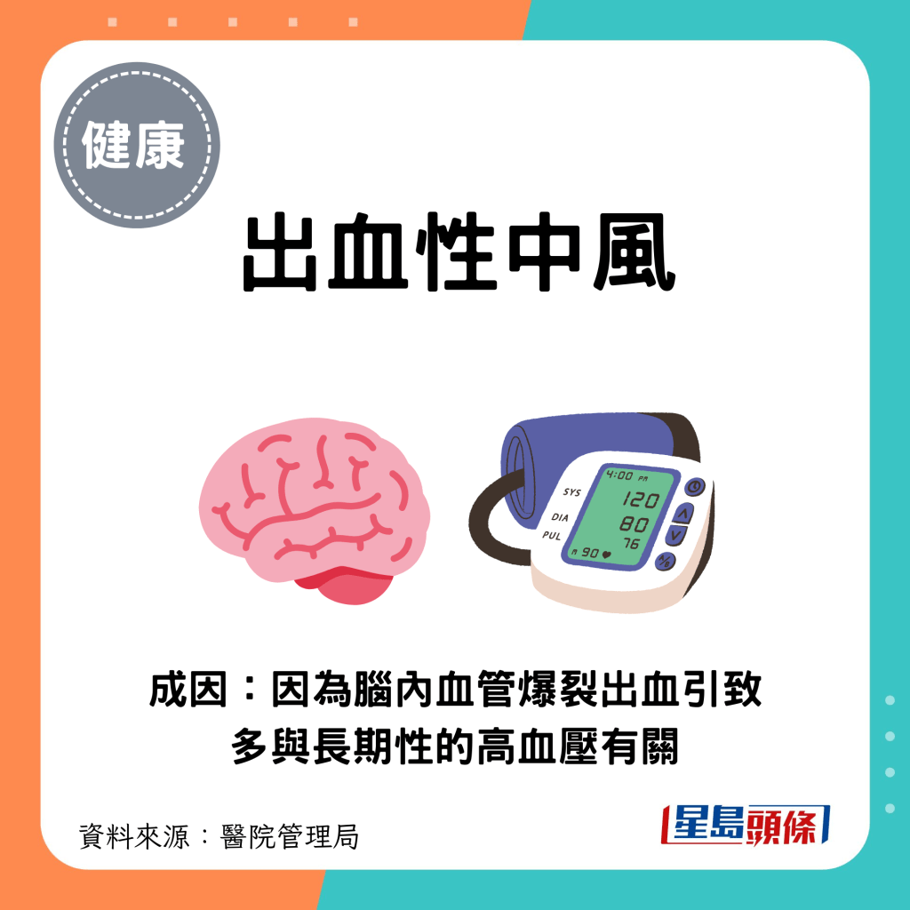 甚么是出血性中風?根據醫管局資料,中風可分為“缺血性中風”和“出血性中風”這2大類型,成因及特征如下: